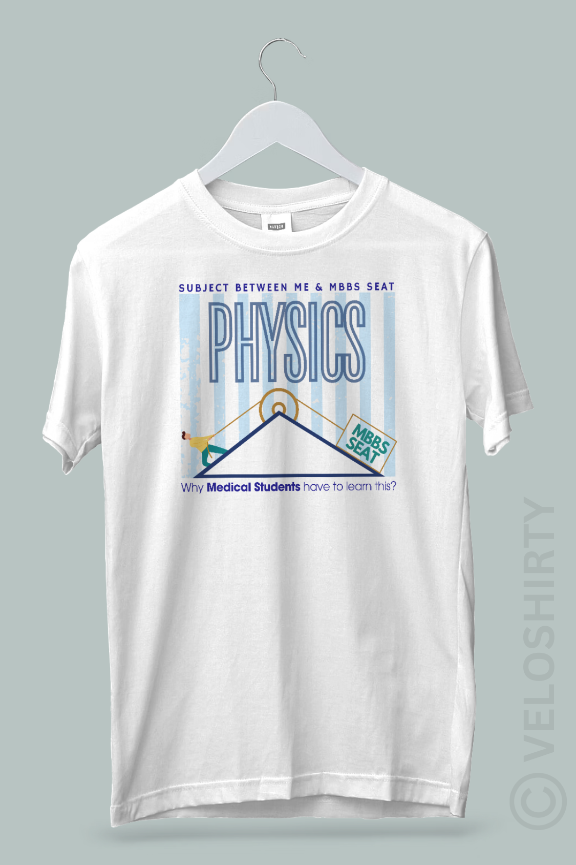 Let’s be real! Physics feels like the only thing standing between you and that sweet MBBS seat! This T-shirt sums up the struggle perfectly with a student dragging an “MBBS SEAT” block up a wedge using a pulley, just like those mind-boggling physics problems you deal with daily.